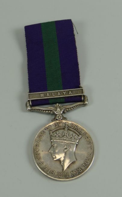 A GEORGE VI GENERAL SERVICE MEDAL with Malaya bar, named to 402848 Act Cpl ###ARRIS RAF (# = scratched)