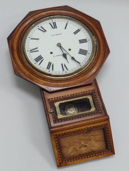 A DROP-DIAL WALL CLOCK IN MARQUETRY CASE having a white enamel dial bearing Roman numerals and 'S.H. PRICE LLANDOVERY', 70cms high