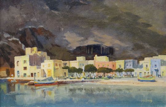 KENNETH HOLMES oil on board - beach front buildings with mountains in the background, 'Xlendigozo' the village of the South West of Malta