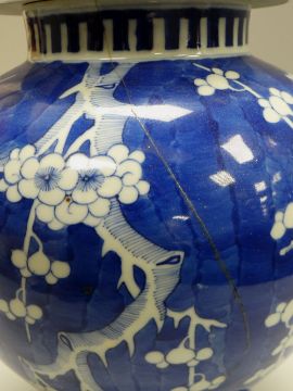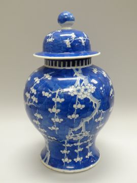 A LARGE CHINESE BLUE & WHITE PRUNUS JAR & COVER, damage, 42cms high