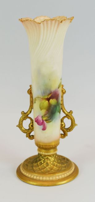 A ROYAL WORCESTER TWIN HANDLED VASE on a spreading circular foot with lattice work moulding, the twin handles of feathered and scrolling form, the neck with swirl moulding to the crimped rim, decorated with roses, date mark for 1917, 24cms high