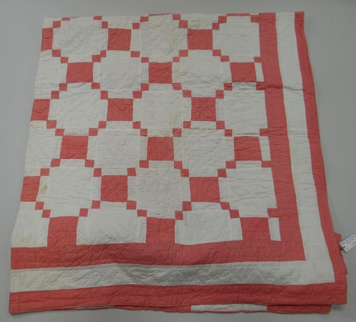 AN EARLY TWENTIETH CENTURY HAND STITCHED PINK & WHITE BED QUILT with striped pattern one side and geometric to the other, 180 x 203cms (consignment from BBC Bargain Hunt)