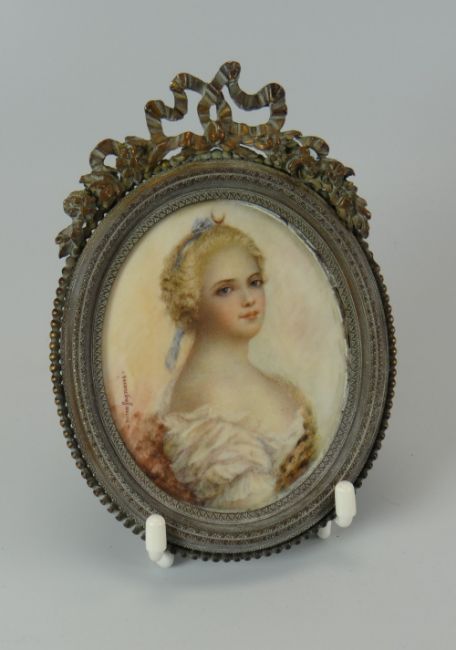 NINA FAGNANI painting on probably ivory - oval portrait miniature of a lady with low-cut dress and blue ribbon in her hair tied-up, signed, within a Stern Brothers, New York ornate metallic frame, 14cms high (incl. frame) Provenance: entered by descendant (Great Great Granddaughter) of French portrait artist Nina Fagnani www.en.wikipedia.org/wiki/Nina_Fagnani item(s) would have belonged to Ms Fagnani