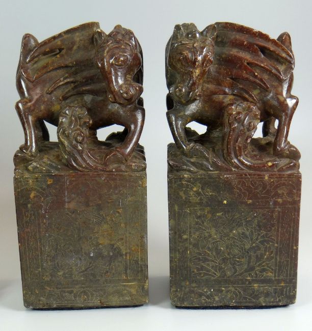 A PAIR OF ORIENTAL MARBLE CREATURES ON PLINTHS in the archaic style, together with two Oriental composition figures