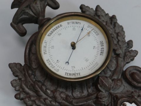 A CAST IRON FRAMED THERMOMETER, BAROMETER & CLOCK by Japy Freres and includes unusual 'Roamer' scale together with Centigrade scale, 65cms high
