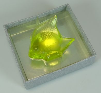 A MODERN LALIQUE GLASS FISH MASCOT with green transparent colour, 5cms high (consignment from BBC Bargain Hunt)