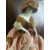 AN UNUSUAL ANTIQUE DOLL within a glass display case and in elaborate dress and bonnet with legs crossed, 30cms high