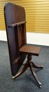 A MAHOGANY TILT-TOP BREAKFAST TABLE of rounded rectangular form and on a reeded four-spoke base with brass socks and castors, 98 x 131cms