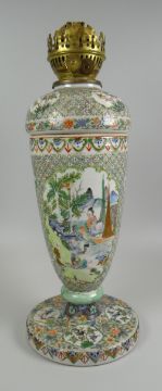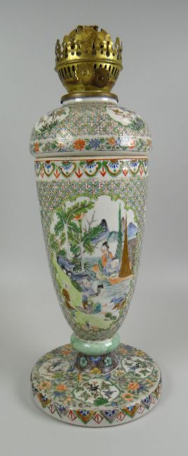A FAMILLE VERT PORCELAIN OIL-LAMP on a spreading circular foot and of baluster form bearing a large panel painted with a scene of figures taming an ox, smaller panels of wildlife and surrounded by typical floral motif decoration, 39cms high