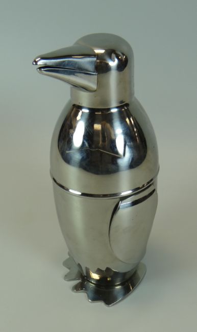 A NOVELTY WHITE METAL COCKTAIL SHAKER in the form of a standing penguin with bow tie, 19cms high (consignment from BBC Bargain Hunt)