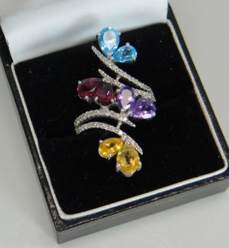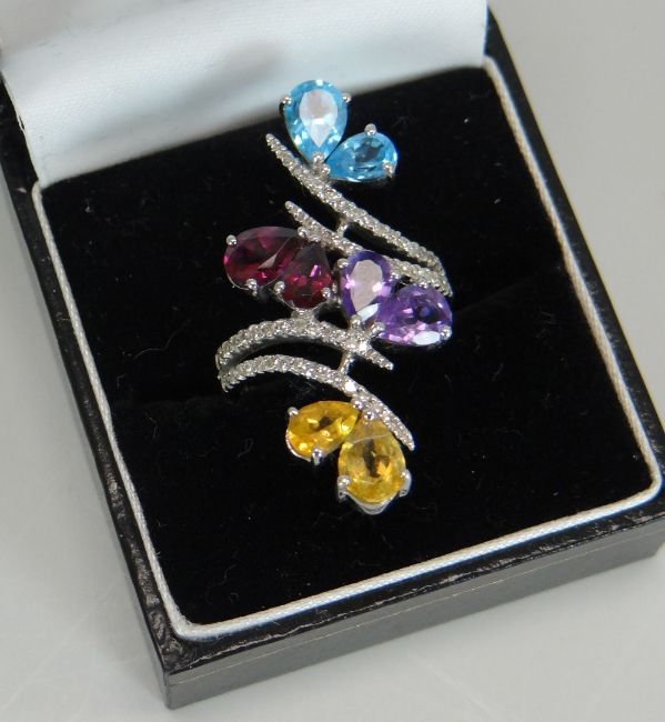 A MODERN 18CT WHITE GOLD, DIAMOND TRICOLOUR GEMSTONE RING