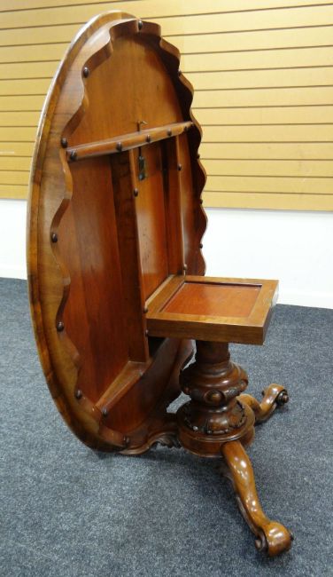 A VICTORIAN BREAKFAST TABLE tilting on a tripod base with scroll supports & heavily carved column and having a wavy frieze, 132cms diam