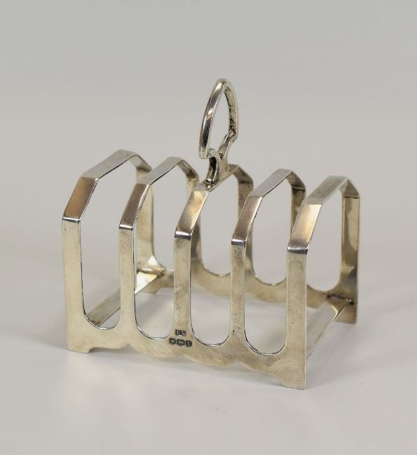 A SILVER FOUR-SECTION TOAST RACK on a shaped base with spear shaped ring handle, Sheffield 1936, 3.4oz