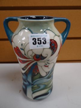 Modern Moorcroft tube lined floral twin handled vase, signed with initials and dated 2008