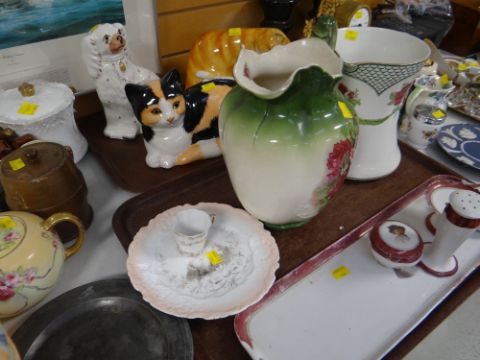 Mixed parcel of pottery including two pottery cats, Staffordshire dog, part toilet sets etc