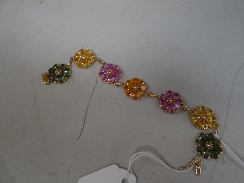9ct tricolour multi-gem floral pear sapphire bracelet Condition report: the total weight is 14.9grams, all stones are present, bright and in very nice condition.