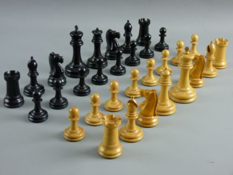 A VICTORIAN JAQUES & SON STAUNTON PATTERN CHESS SET in weighted boxwood and ebony, the 3.5 ins Kings marked Jaques, London, one of each Knight and Rook with crown stamp, in original mahogany box with key, baize lined interior and paper label (black Queen base split, three black Pawns and one white Pawn with losses to collars)