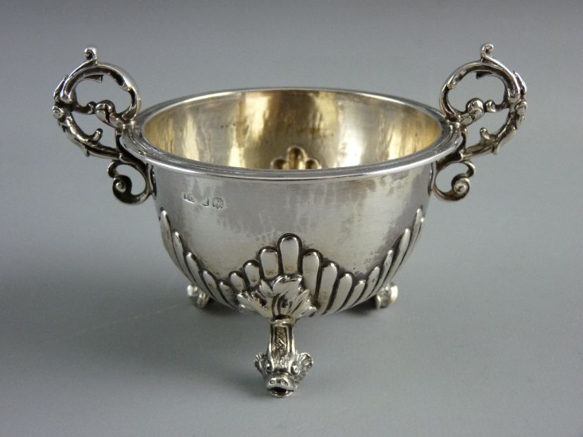 A CIRCULAR SILVER TWIN HANDLED POT on three leaf and dolphin mask supports, maker's mark 'E C', date mark indistinct but bears clearly to the base 'Sir J Campbell-Orde, For Indian Bull, Edinburgh, 1884', 3.8 troy ozs LOT WITHDRAWN