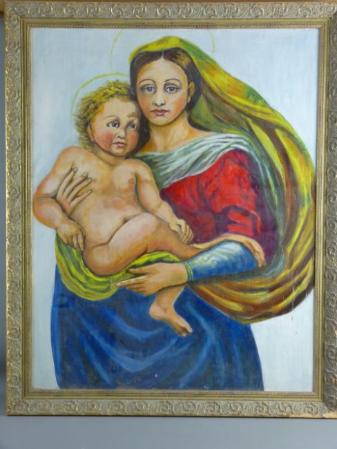 POSSIBLY CONTINENTAL SCHOOL oil on canvas laid on board, circular format - Mary with Jesus and John the Baptist as children (in delicate condition, for restoration), 70 cms diameter together with a large oil on board religious modern painting of mother and child