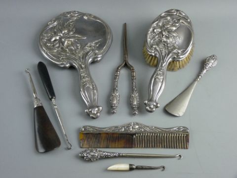 A SILVER BACKED DRESSING MIRROR, HAND BRUSH & COMB with elaborate raised floral decoration, Chester 1909, a parcel of six manicure pieces, three with silver handles and a shoe horn and hook of ebony etc