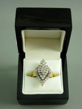 AN EIGHTEEN CARAT GOLD DIAMOND DRESS RING having forty two small round cut diamonds in three graduated tiers, 10.5 grms gross, size 'P/Q'