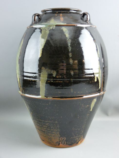 JIM MALONE (1946-) CONTEMPORARY POTTERY THREE HANDLED BULBOUS VASE decorated with a Tenmoku glaze on a segmented and banded body, impressed monogram seal to side, along with a signed solo exhibition poster for Winter Exhibition 2000/2001 at The Oakwood Gallery, signed in pencil, no. 31/50, 40 cms high the vase