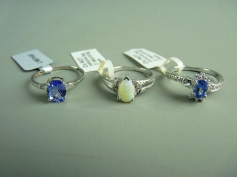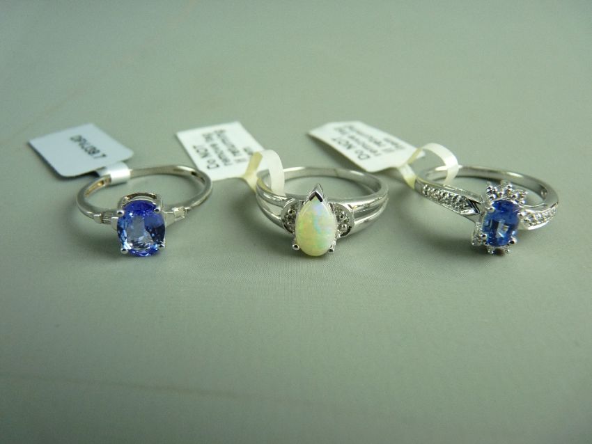 THREE RINGS - a nine carat white gold diamond and tanzanite ring, 1.7 grms gross, size 'N/O', a nine carat white gold Ceylon sapphire and diamond dress ring, 3 grms gross, size 'N/O' and a nine carat white gold jelly opal pear cut dress ring, 2.4 grms gross, size 'N'