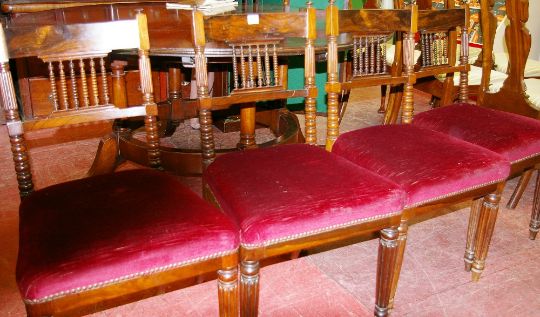 A SET OF FOUR ROSEWOOD PARLOUR CHAIRS, circa 1900 with delicate bobbin turned spindle back rail, velvet upholstered seats and reeded front supports
