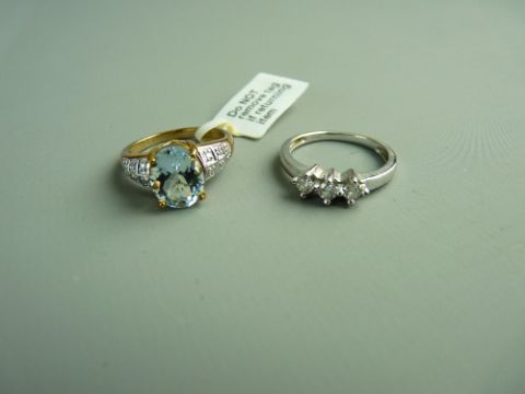 A NINE CARAT GOLD AQUAMARINE & DIAMOND DRESS RING, 3.7 grms gross, size 'N/O' and a nine carat white gold three stone round cut diamond dress ring, 2.5 grms gross, size 'N/O'