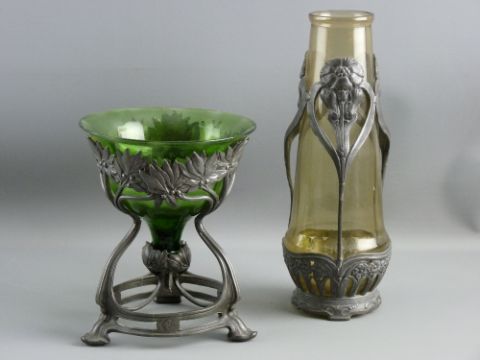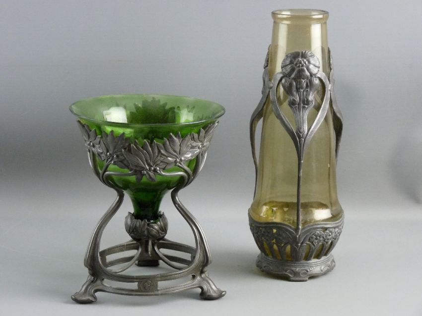 TWO ART NOUVEAU METAL & GLASS VASES, one in the form of a semi-suspended bowl held aloft by a spread of leafy branches of stylized form with conjoining lower support in a pierced circular three footed base, possibly by Zsolnay, 17 cms high, 14 cms diameter, the other 25 cms high blown into a pierced stand with extending stylized flowers to just below the collar