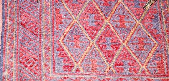 A TRIBAL KAZAK RUG, deep red ground woollen woven rug with central repeated diamond pattern and triple bordered edges, 128 x 118 cms