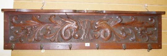 A VINTAGE MAHOGANY COAT RACK & SHELF with carved panel of mythical beasts and central 'W A' monogram, 27.5 cms high, 113 cms long