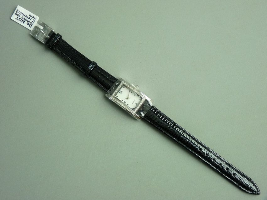 A LADY'S OBLONG DIAL QUARTZ WHITE METAL FRAMED DRESS WATCH, with forty tiny diamonds and with black leather strap, cased
