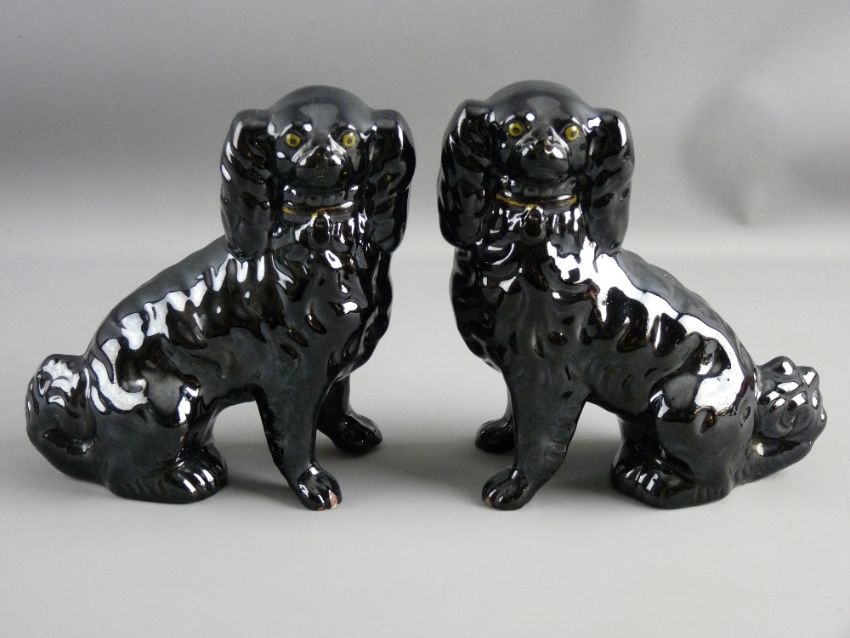 A PAIR OF BLACK JACKFIELD POTTERY TYPE SEATED SPANIELS with open front legs, gilt collars and painted eyes, 16 cms high, 16 cms wide (small glaze chips to front paws, gilt collars rubbed)