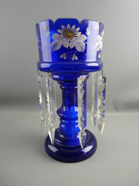 A VICTORIAN BLUE GLASS LUSTRE with castellated top and enamel painted floral band on a shaped stem and stepped circular base and seven prism glass droplets, 35.75 cms high, (chips to interior rim, main body with 13 cms crack)