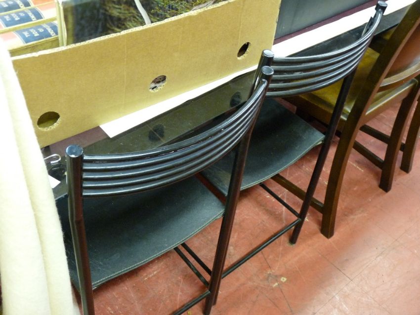 Contemporary glass topped dining table on a heavy stone pedestal with a set of six chairs