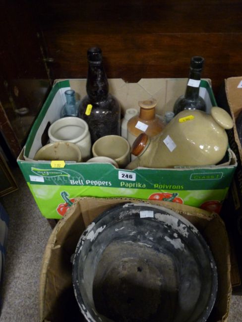 Box of earthenware, vintage glassware, planters etc