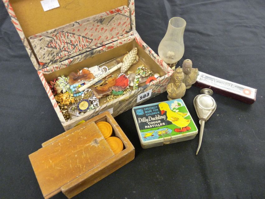 Small lidded box with jewellery contents, small box of draughts etc