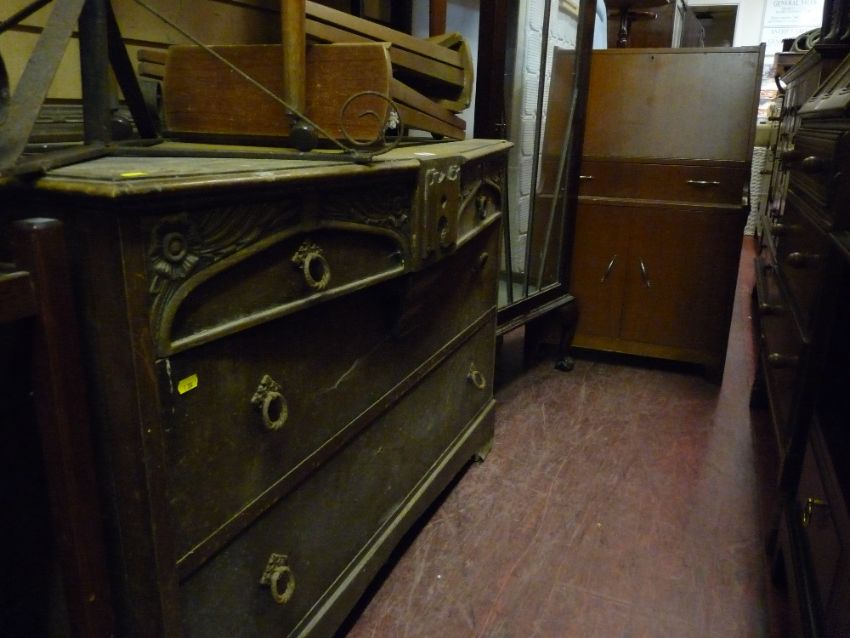 An oak chest of four drawers, a single door china display cabinet & a small bureau
