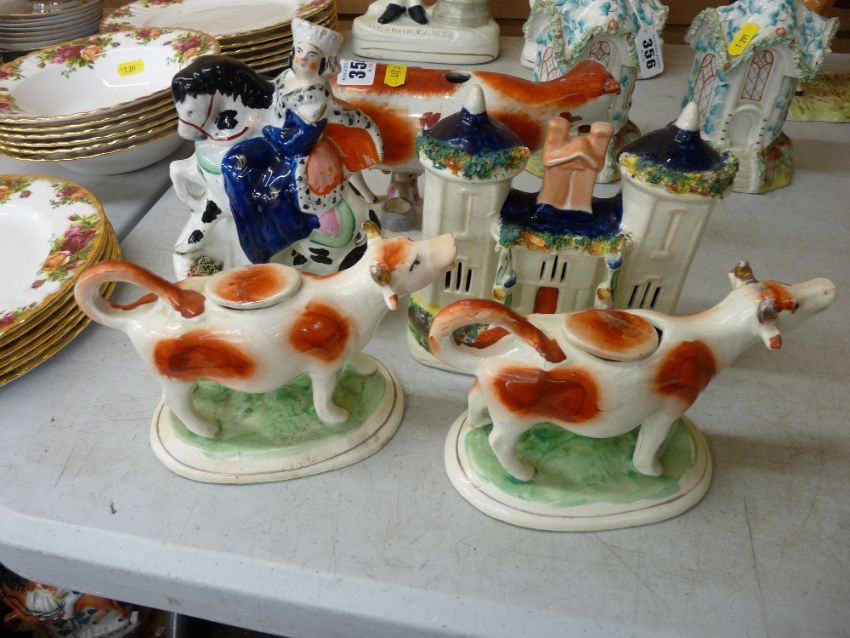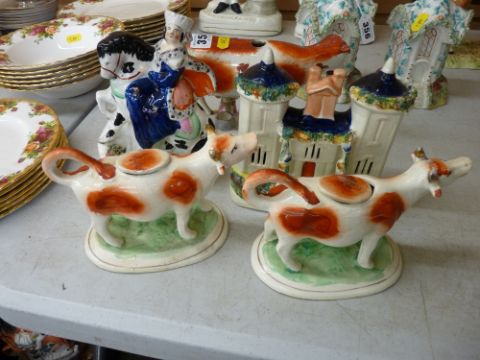 A pair of Staffordshire cow creamers, a Staffordshire cow creamer with milkmaid (damaged), a Staffordshire pottery cottage & a Staffordshire equestrian figurine