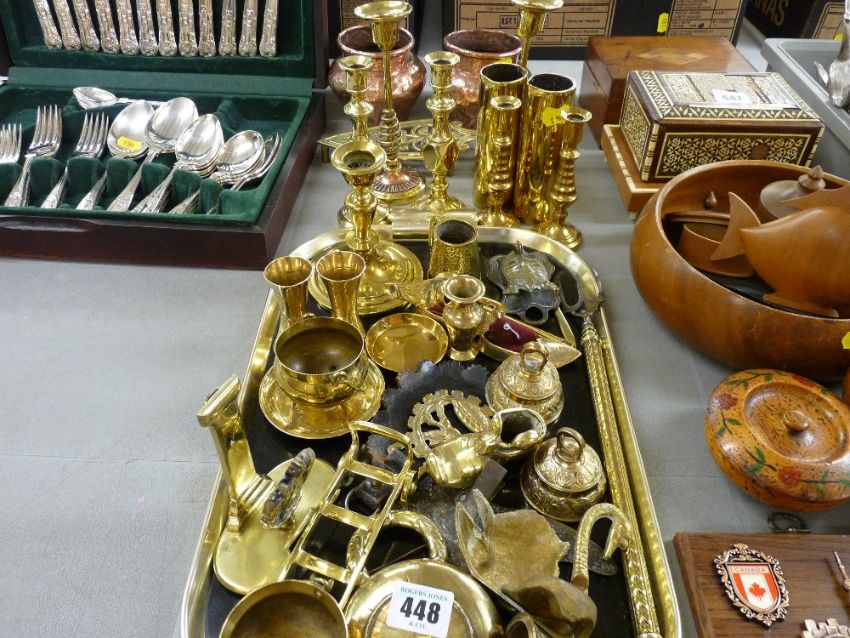 A mixed parcel of ornamental brassware including candle holders, trench art & some copperware