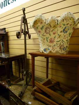 A two-tier side table, a set of three glass topped reproduction tables, a mid-century standard lamp & shade, a set of three tables & a wrought iron stand (a parcel)