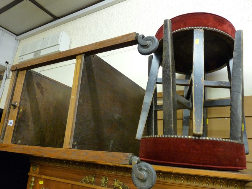 An oak two-tier trolley with drawer & a pair of upholstered top footstools