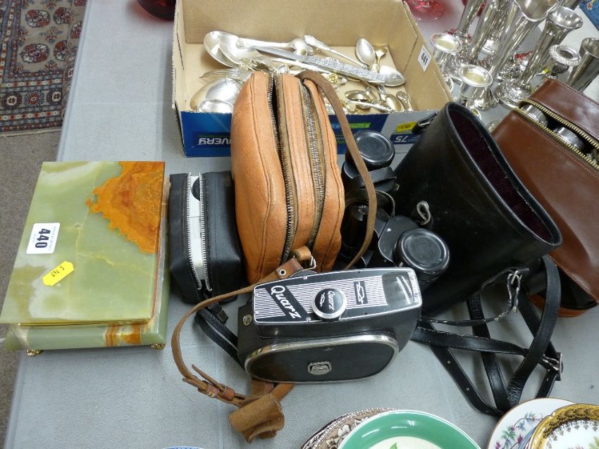 Quantity of vintage binoculars in cases, an onyx cigarette box & a cased quartz cine camera etc