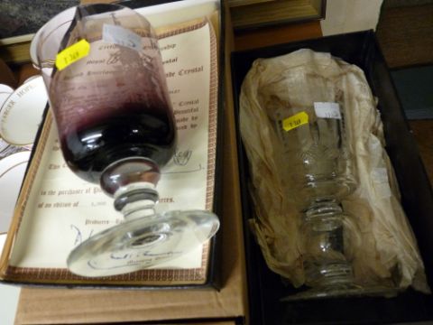 Two etched commemorative glass tumblers