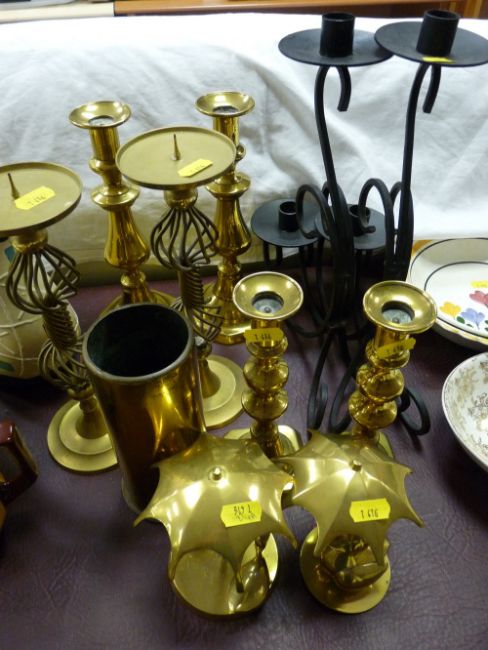 Three pairs of vintage brass candlesticks, other ornamental brassware etc