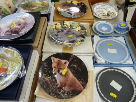 A quantity of boxed Bradex & similar display plates together with Wedgwood Jasperware commemorative items