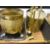 Two brass coal buckets, fire irons & guards