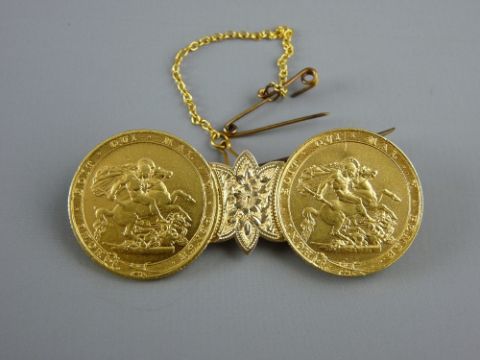 TWO GEORGE III GOLD SOVEREIGNS, 1817 and 1820 conjoined to form a brooch with pin and safety chain, 18 grms gross