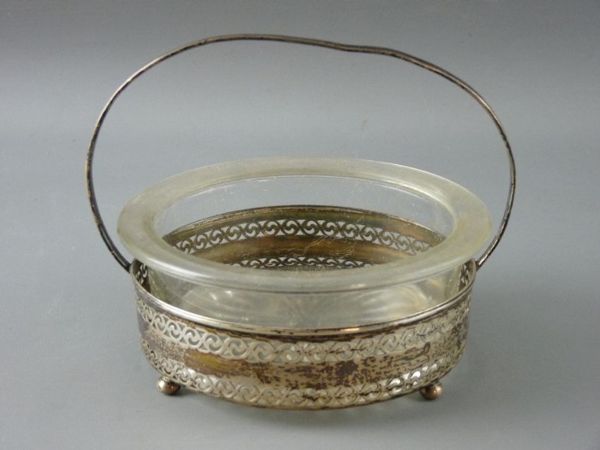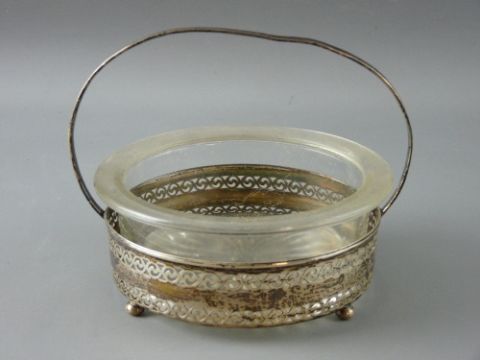A GLASS BUTTER DISH ON A PIERCED SILVER STAND, 2.3 troy ozs, London 1929